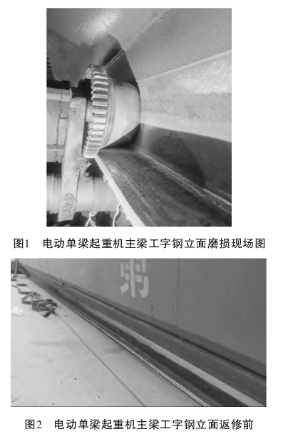 單主梁起重機械主梁工字鋼常見的失效形式有主梁工字鋼磨損、腐蝕、焊縫裂紋、主梁下撓等。由于單主梁起重機主梁工字鋼作為起升機構——電動葫蘆的運行軌道,在重物起吊、搬運過程中,電動葫蘆運行勢必會造成工字鋼磨損,這種磨損是主梁工字鋼最常見的失效形式。且常發生在2-3年使用過程中。